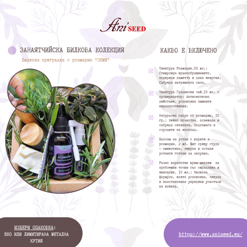 Занаятчийска билкова колекция „Билкова прегръдка с розмарин Земя“ в еко или метална кутия с размери 150х150мм
