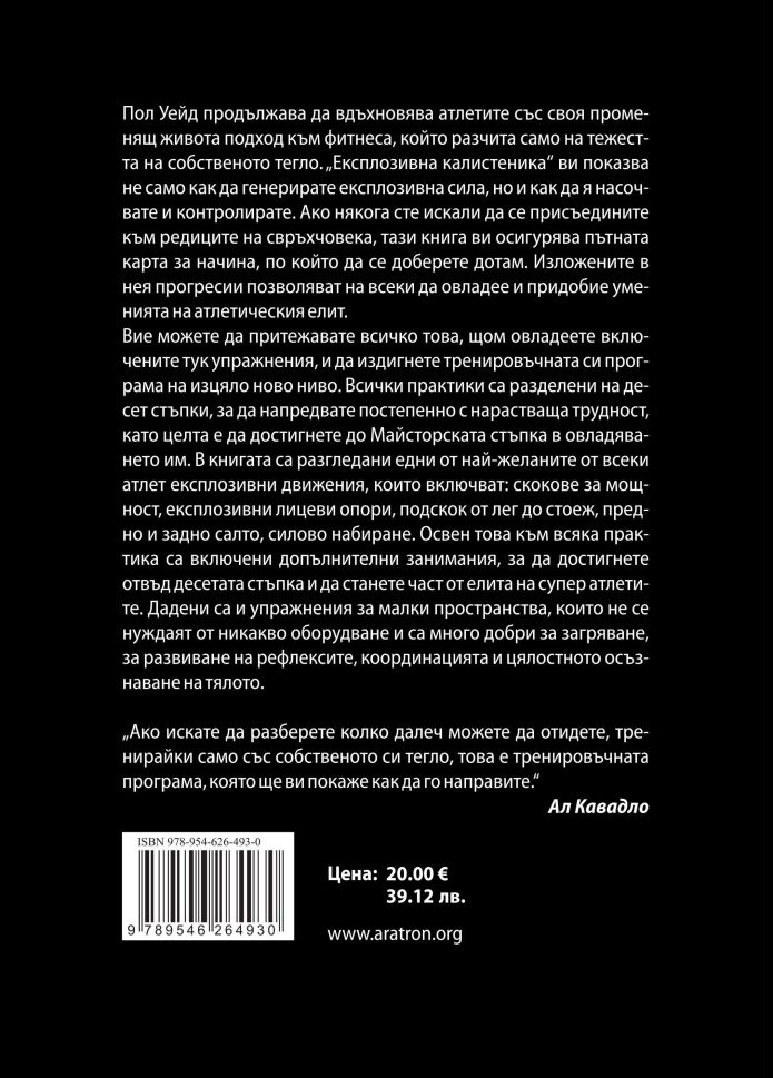 Пол Уейд продължава да вдъхновява атлетите със своя променящ живота подход към фитнеса, който разчита само на тежестта на собственото тегло. „Експлозивна калистеника“ ви показва не само как да генерирате експлозивна сила, но и как да я насочвате и контролирате. Ако някога сте искали да се присъедините към редиците на свръхчовека, тази книга ви осигурява пътната карта за начина, по който да се доберете дотам. Изложените в нея прогресии позволяват на всеки да овладее и придобие уменията на атлетическия елит.